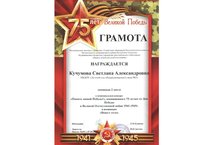 Поздравляем нашего музыкального руководителя Кучумову Светлану Александровну, занявшую II место в муниципальном конкурсе "Память нашей Победы!", посвященного 75-летию Победы и Великой Отечественной войне 1941-1945г. в номинации "Вокал-соло".