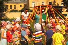 В рамках летней оздоровительной работы состоялась встреча ребят старшей группы «Почемучки» и младшей группы «Карапузы». «Приехав» на паровозике, дети поприветствовали друг друга веселой песенкой «Добрый день». На станции «Танцевальная» ребята младшей группы с удовольствием показали свой танец, пригласив детей старшей группы, а ребята старшей группы пригласили малышей в свой танец «Дружные тройки». На следующей станции «Инструментальная», ребята с удовольствием побывали в мире струнно-смычковых инструментов, там они слушали звучание скрипки, виолончели и контрабаса, эмоционально рассказывали о каждом из инструментов. Наш паровозик привез ребят на станцию «Песенка-чудесенка» где мы услышали несколько песенок-распевок, которые ребята исполнили, показывая жестом руки направление мелодии. Ребята друг другу аплодировали, слушая новые песни. А закончилась наша встреча веселой музыкальной игрой «Дирижер». Обе группы радостные и веселые «отправились» на паровозике в свои группы.
