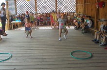 Неделя веселых игр и забав на воздухе завершилась спортивным праздником. Воспитанники соревновались в ловкости и умении при этом стать победителем. В ходе мероприятия использовались такие виды игр как: бег в галошах, не замочи ног, перенеси воду не пролив ни капли, не урони яйцо, попади в цель и т.д. Спортивные паузы заполнялись танцами, песнями и играми малой подвижности.