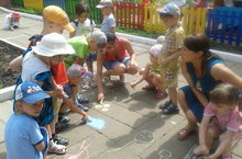 В один из солнечных, но ветреных дней, дошколята решили поиграть с ветерком и придумали забаву – пустить по ветру мыльные пузыри. Сколько было радости в глазах у малышей, когда легкие, радужные мыльные шарики разлетались в небо! Надеемся, что ветерку тоже понравилось играть вместе с детьми.