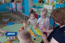 Самые маленькие воспитанники детского сада под руководством своего воспитателя Е.В.Нигматуллиной готовят коллективный рисунок. Скоро в ДОУ выставка коллективных детских работ "Каляки-маляки".