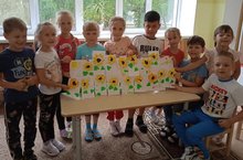 Сегодня воспитатель старшей группы № 8 "Затейники" увлекла ребят творческой работой, в результате которой в группе появилось настоящее поле солнечных подсолнухов