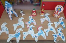 Группа "Незабудка" познакомилась с дымковскими игрушками и сами попробовали раскрасить коня дымковскими узорами. У ребят неплохо получилось!