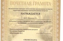 По результатам санитарно-экологического двухмесячника по очистке территорий населенных пунктов Республики Татарстан МБОУ "ГИМНАЗИЯ №1" - ПОБЕДИТЕЛЬ конкурса "ЭКОВЕСНА - 2016" в номинации "ЭКОШКОЛА" Чистопольского муниципального района.