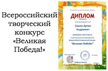 Поздравляем Сашина Артёма, ученика 6Б класса за занятое 2 место во Всероссийском творческом конкурсе "Великая Победа!" (рук. Фасхутдинова Т.Е.). МОЛОДЕЦ!