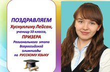 Спешим поздравить Хуснуллину Лейсан, ученицу 10 класса, которая стала призером Регионального этапа Всероссийской олимпиады школьников по русскому языку (учитель Шилова Е.М.).