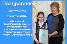 Поздравляем Садриеву Диляру, ученицу 4А класса (уч. Комарова И.В.), победителя XIII республиканской научно-исследовательской конференции школьников "Рождественские чтения" (секция "Окружающий мир"). Молодец!