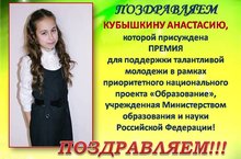 Кубышкина Анастасия, став победителем VII Региональной научной конференции учащихся 8-11 классов, была номинирована на Премию Президента РФ В.В.Путина, которая присуждается в рамках приоритетного национального проекта "Образование", учрежденная МО и Н РФ для поддержки талантливой молодежи.