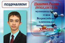 Поздравляем Никитина Руслана, ученика 9Б класса ПОБЕДИТЕЛЯ муниципального тура Всероссийской олимпиады школьников по химии. МОЛОДЕЦ!