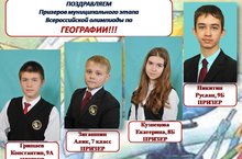 Поздравляем: Гришаева Константина, 9А кл., Зиганшина Алика, 7 кл., Кузнецову Екатерину, 8Б кл., Никитина Руслана, 9Б кл. ПРИЗЕРОВ муниципального тура Всероссийской олимпиады школьников по географии! ПОЗДРАВЛЯЕМ!!!