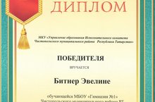 Битнер Эвелина, 7А сыйныфы укучысы (укытучысы Сабитова Л. М.) К.Тинчуринның тууына 134 ел тулуга багышланган V Республика конкурсының муниципаль этабында эскиз-рәсем номинациясендә җиңү яулавы белән котлыйбыз.
