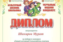 Поздравляем Шакирова М., ученика 2 класса (кл.рук.Комарова И.В.) - ПОБЕДИТЕЛЯ республиканского конкурса "Самый активный пользователь портала "Культурный дневник школьника"". Молодец! Так держать!