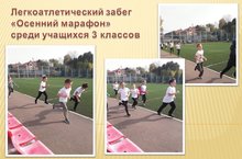 С целью пропаганды физической культуры и здорового образа жизни 1 октября среди учащихся 3 классов был проведен легкоатлетический забег «Осенний марафон». ( уч.физической культуры Долгова О.А.). Во время соревнований ребята продемонстрировали свои скоростные качества, силу воли, выносливость.