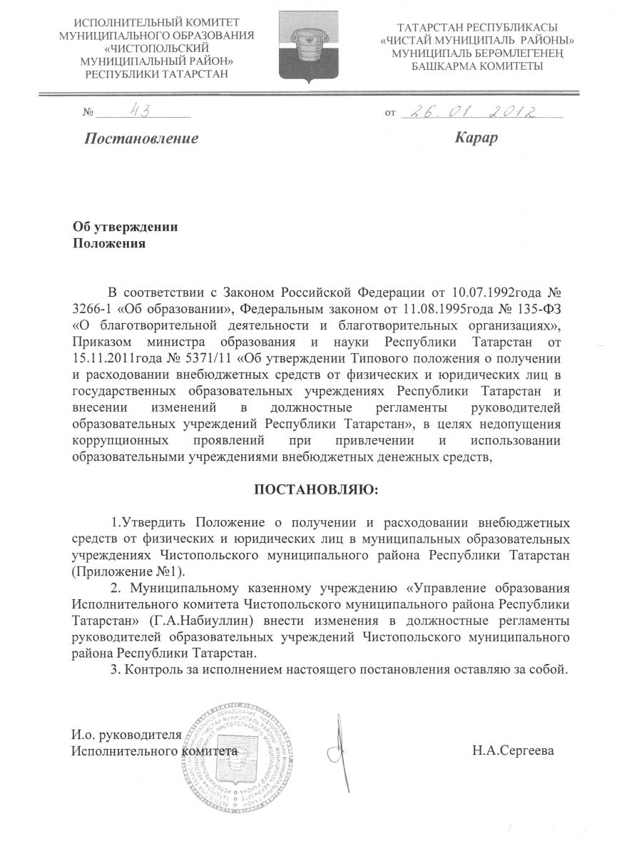 Постановление об утверждении Типового положения о получении и расходовании внебюджетных средств от физических и юридических лиц в государственных образовательных учреждениях РТ