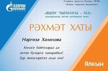 8 нче "А" сыйныфы укучысы Хәлилова Нәргизә "Ялкын" журналы үткәргән "Яшәү чыганагы - газ" республикакүләм конкурсында катнашып, Рәхмәт хаты белән бүләкләнде.