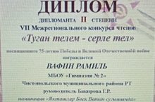 4 нче сыйныф укучысы Вафин Р. VII Төбәкара "Туган телем - серле тел" бәйгесендә II нче дәрәҗәле дипломант булды.
