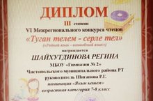 Ученица гимназии 7 "А" класса Шайхутдинова Регина награждена Дипломом 3 степени VI Межрегионального конкурса чтецов «Туган телем - серле тел» ("Родной язык - волшебный язык"), в номинации «Якын кешем», научный руководитель Шигапова Р.Г. Поздравляем с достойной победой и желаем дальнейших успехов и побед!