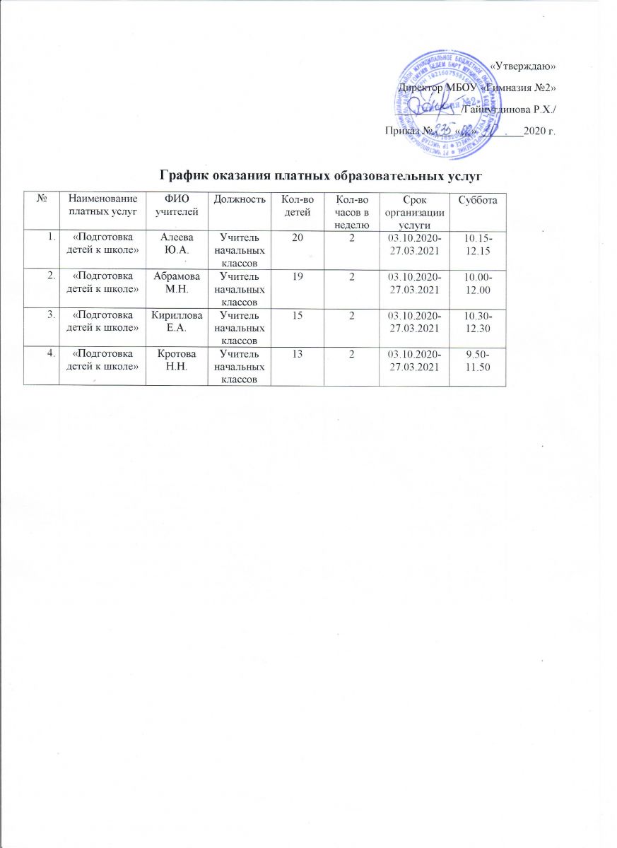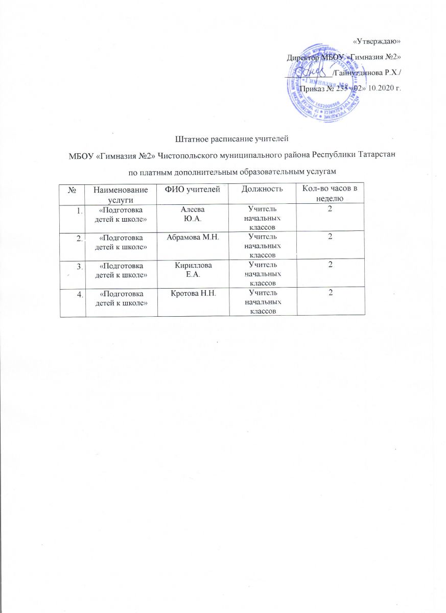 Штатное расписание оказания платных услуг на 2020-2021 учебный год