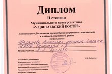 Наши преподаватели и учащиеся приняли участие в муниципальном конкурсе чтецов " V ЦВЕТАЕВКИЙ КОСТЕР". Поздравляем: Абдуллина Ф. Т. ( преподаватель - призер), Шаламова Виктория (ученица 2А класса-Диплом II cтепени), Николаев Егор (ученик 3Д класса Гран-при), Мангулова Камила (ученица 5А класса -участник).