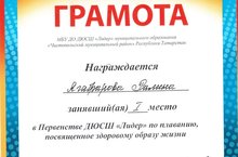 В предверии осенних каникул детско-юношеская спортивная школа "Лидер" провела первенство по плаванию, посвященному здоровому образу жизни, где ученица 2А класса- Ягафарова Ралина заняла 1 место. Молодец, так держать!