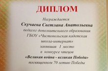 Светлану Анатольевну Скучаеву, занявшую I место в конкурсе чтецов "Великая война - великая Победа", посвященном 70-летию Победы!