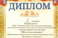 команду ГБОУ "Чистопольская кадетская школа-интернат" (руководитель Харитонов Д.В.), занявшую II место в военно-патриотической игре "Школа выживания", проводимой в рамках коллективно-творческого дела "Я помню, я горжусь!" в г. Набережные Челны