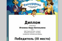 Игонину Аиду, ученицу 3 класса с победой во Всероссийском творческом конкурсе «Рассударики», номинация «Портфолио школьника».
