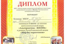 Поздравляем команду нашей школы, занявшую I место (руководитель Новикова Н.П.) в интеллектуальной игре "Альтернатива-ЖИЗНЬ" в рамках Республиканской акции "Мир без наркотиков"