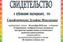 Воспитатель - Гарафутдинова Зульфия Мансуровна опубликовала статью в сборнике «Современные изобразительные материалы как средство художественно- эстетического развития дошкольников» / Тәрбияче-Гәрәфетдинова Зөлфия Мансур кызы «Мәктәпкәчә яшьтәге балаларның сәнгати - эстетик үсеше чарасы буларак заманча рәсем материаллары " җыентыгында мәкаләне бастырып чыгарды»