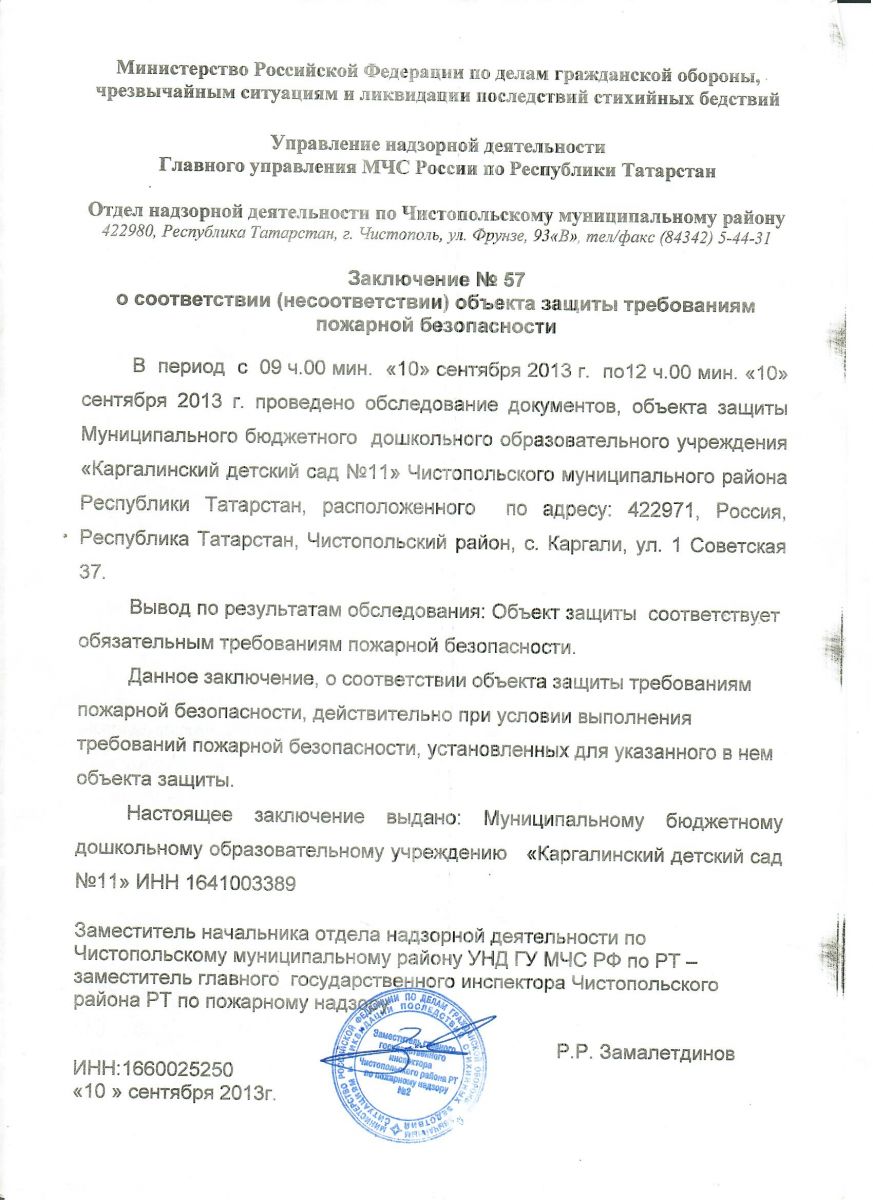 Заключение о соответствии (несоответствии) объекта требованиям пожарной безопасности