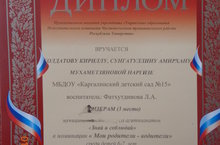 Дипломом награждены Сунгатуллин Амирхан, Солдатов Кирилл и Мухаметзянова Наргизя за участие в муниципальном конкурсе агитплакатов "Знай и соблюдай" в номинации " Мои родители-водители".