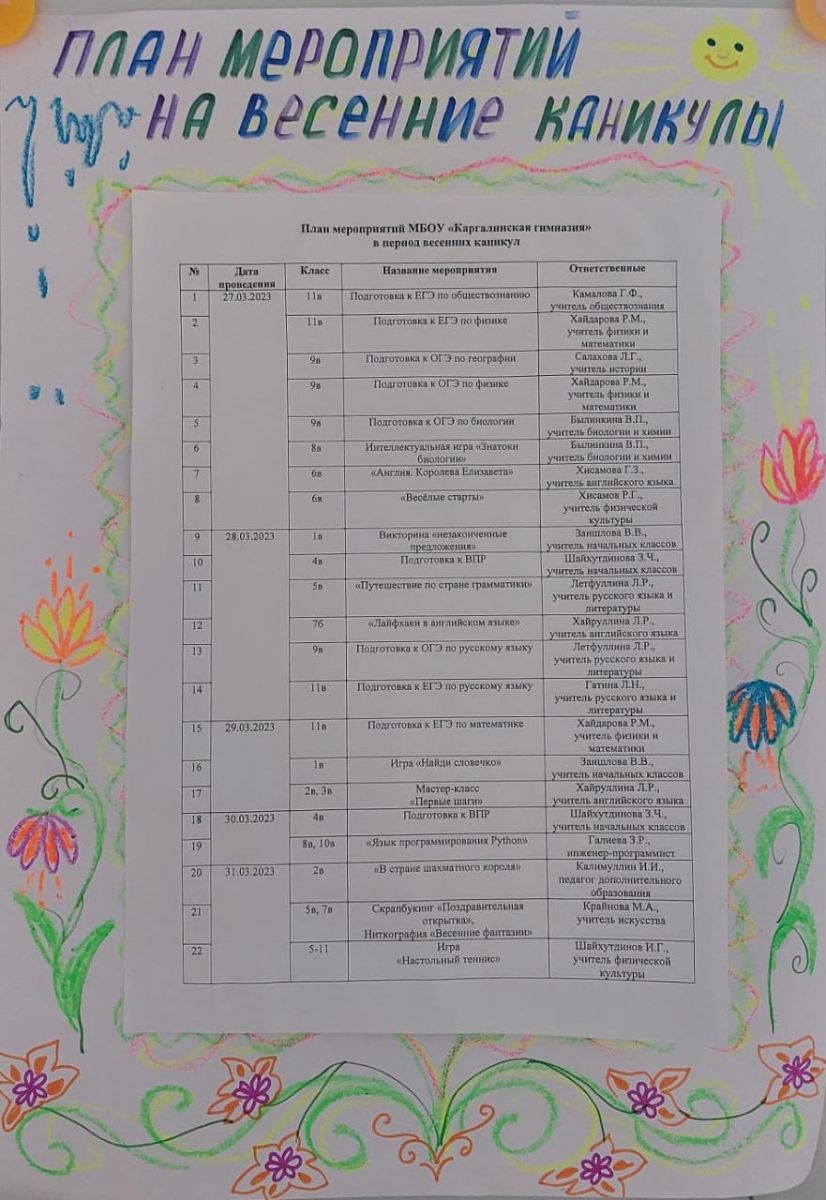 План мероприятий в период весенних каникул