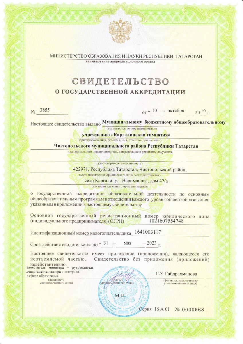 Муниципальное бюджетное общеобразовательное учреждение «Каргалинская гимназия» Чистопольского муниципального района Республики Татарстан/Татарстан Республикасы Чистай муниципаль районының "Каргалы гимназиясе" муниципаль бюджет гомуми белем бирү учреждениесе