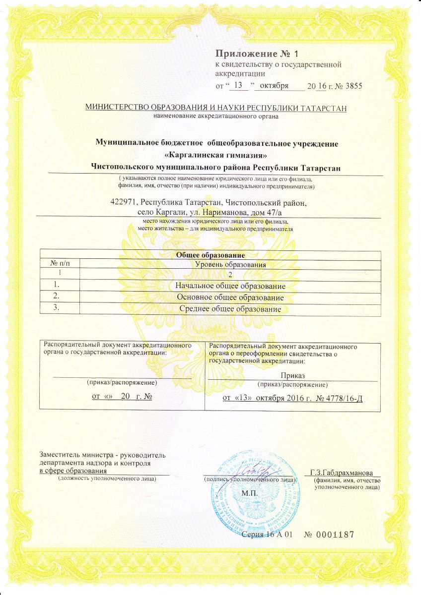 Устава МБОУ "Каргалинская гимназия" Муниципального бюджетного общеообразовательного учреждения «Каргалинская гимназия» Чистопольского муниципального районаРеспублики Татарстан утверждён Постановлением Исполнительного комитета Чистопольского муниципального района Республики Татарстан от 06.09.2018 г. № 726, зарегистрирован в МРИ ФНС РФ №12 по Республике Татарстан от 25.09.2018 г.