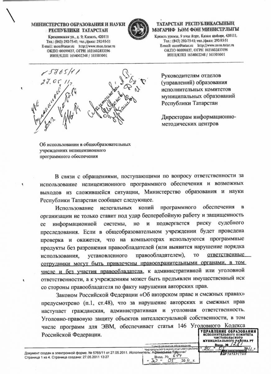 Письмо "Об использовании в общеобразовательных учреждениях нелицензионного программного обеспечения"