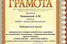 В рамках работы муниципального ресурсного центра «Чишмә» прошел муниципальный конкурс методических разработок по ознакомлению дошкольников с национальными блюдами народов Поволжья “ Вкусная книга”- “Тәмле китап”. Наш педагог Хатыпова А.М.стала победителем!Поздравляем!"Чишмә "муниципаль ресурс үзәге эше кысаларында мәктәпкәчә яшьтәге балаларны Идел буе халыкларының "тәмле китап"- "Тәмле китап" - "Тәмле китап" белән таныштыру буенча методик эшләнмәләрнең муниципаль конкурсы булып узды. Безнең педагог Хатыпова А. М. җиңүче булды!Котлыйбыз!