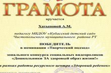 С целью формирования у детей дошкольного возраста мотивации к ведению здорового образа жизни наш детский сад принял участие в зональном конкурсе социальных видеороликов «Дошкольники ЗА здоровый образ жизни!». Мы стали победителями в номинации «Творческий подход».Мәктәпкәчә яшьтәге балаларнысәламәт яшәү рәвешенәкызыксындыру тәрбияләү максаты белән безнең балалар бакчасы «Мәктәпкәчә яшьтәге балалар сәламәт яшәү рәвеше өчен!»зональсоциаль видеороликлар конкурсында катнашты. Без номинациядә җиңүчеләр!