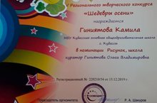 Ученица 2 класса Гиниятова Камила приняла участие в региональном конкурсе "Шедевры осени". Диплом I степени. (Рук. Гиниятова О.В.)