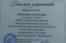 Шавалиева А. А. 7 сыйныф укучысы (җит. Шавалиева С.Б.) IV Бөтенроссия (X Республика) ачык иҗат бәйгесенең II дәрәҗә дипломын алды "Пушкин укулары" конкурсы.