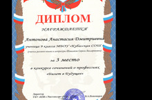 Учащуюся 9 класса Антонову Анастасию, занявшую 3 место в конкурсе сочинений о профессиях "Билет в будущее" Диплом вручил директор ГКУ "ЦЗН г. Чистополя В.А. Пономарев