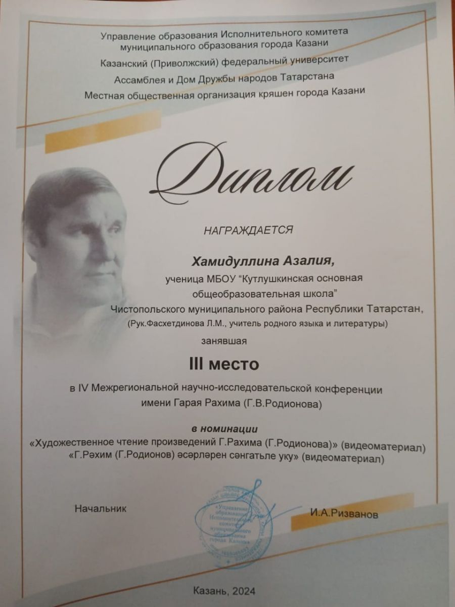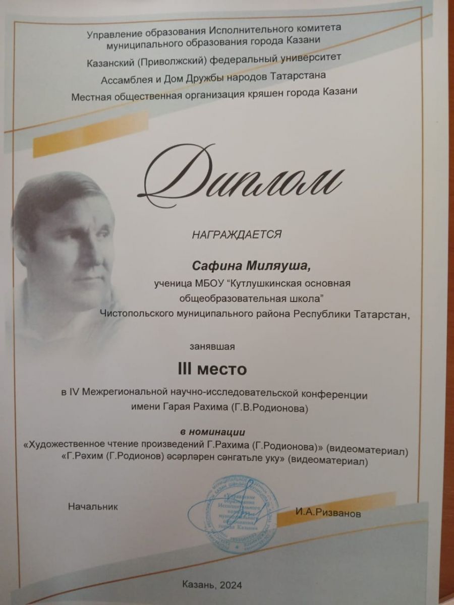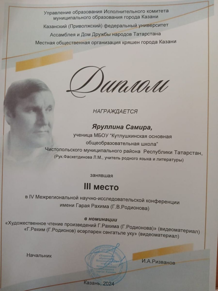 Честь нашего Муниципального бюджетного общеобразовательного учреждения «Кулушкинская основная общеобразовательная школа» Чистопольского муниципального района Республики Татарстан защитила учитель родного (татарского) языка и литературы -Фасхетдинова Лилия Марсельевна, принявшая участие в секции «Народы Поволжья: общие узоры, культура, традиции, фольклор».Учащиеся 5 класса: Хамидуллина Азалия Альбертовна и Яруллина Самира Ильясовна, 7 класса : Гарифуллина Дина рушановна и Сафина Миляуша Ильшатовна приняли участие в секции «Художественное чтение произведений Г. Рахима (Г. Родионова)» заняли III место. Они были награждены дипломами .