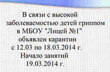 с 12.03 по 18.03.2014 - в МБОУ "Лицей №1" объявлен карантин 18.03.2014