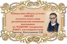 Поздравляем Айсылу Хамидуллину и её учителя Гульнару Шаукатовну Фасхутдинову с ПРИЗОВЫМ МЕСТОМ в муниципальном этапе Республиканской олимпиады школьников по РОДНОМУ (татарскому) ЯЗЫКУ среди учащихся 5 классов и желаем им новых ПОБЕД! Молодцы!!!