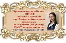 Поздравляем Азалию Хусаинову и её учителя Гульнару Шаукатовну Фасхутдинову с ПРИЗОВЫМ МЕСТОМ в муниципальном этапе Республиканской олимпиады школьников по РОДНОМУ (татарскому) ЯЗЫКУ среди учащихся 8 классов и желаем им новых ПОБЕД! Молодцы!!!