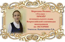 Поздравляем Полину Морозову и её учителя Галину Анатольевну Капитонову с ПРИЗОВЫМ МЕСТОМ в муниципальном этапе Всероссийской олимпиады школьников по ИСТОРИИ среди учащихся 7 классов и желаем им новых ПОБЕД! Молодцы!!!