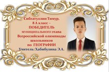 Поздравляем Тимура Сибгатуллина и его учителя Эльвиру Асгатовну Хабибулину с ПОБЕДОЙ в муниципальном этапе Всероссийской олимпиады школьников по ГЕОГРАФИИ среди учащихся 7 классов и желаем им новых ПОБЕД! Молодцы!!!