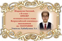 Поздравляем Евгения Шарангина и его учителя Эльвиру Асгатовну Хабибулину с ПРИЗОВЫМ МЕСТОМ в муниципальном этапе Всероссийской олимпиады школьников по ГЕОГРАФИИ среди учащихся 7 классов и желаем им новых ПОБЕД! Молодцы!!!