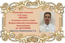 Поздравляем Алексея Платонова и его учителя Галину Анатольевну Капитонову с ПРИЗОВЫМ МЕСТОМ в муниципальном этапе Всероссийской олимпиады школьников по ИСТОРИИ среди учащихся 11 классов и желаем им новых ПОБЕД! Молодцы!!!