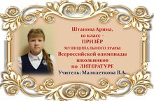 Поздравляем Арину Штанову и её учителя Веру Александровну Малолеткову с ПРИЗОВЫМ МЕСТОМ в муниципальном этапе Всероссийской олимпиады школьников по ЛИТЕРАТУРЕ среди учащихся 10 классов и желаем им новых ПОБЕД! Молодцы!!!