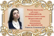 Поздравляем Анастасию Рясову и её учителя Татьяну Анатольевну Семенову с ПОБЕДОЙ в муниципальном этапе Всероссийской олимпиады школьников по ЛИТЕРАТУРЕ среди учащихся 9 классов и желаем им новых ПОБЕД! Молодцы!!!